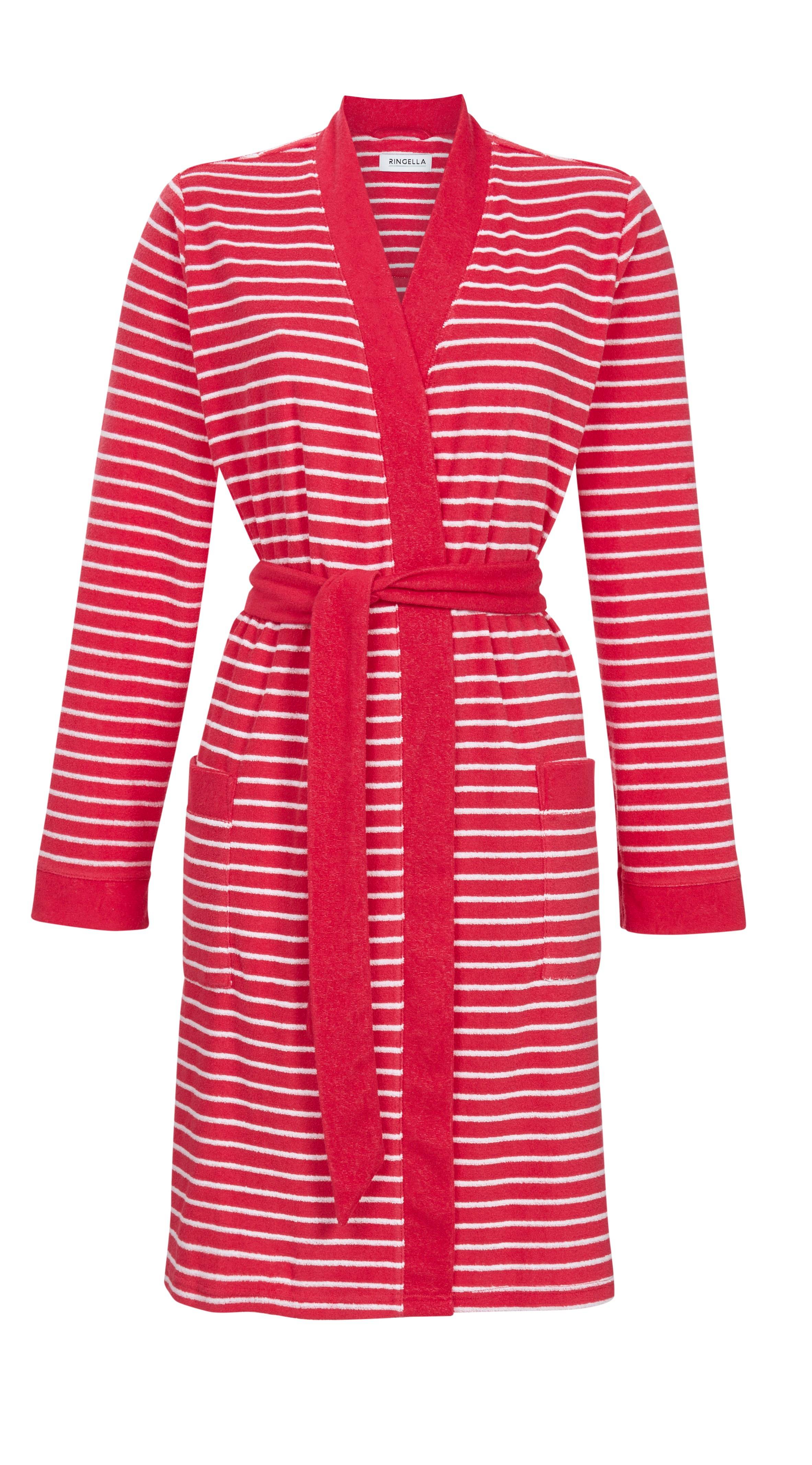 Eleganter Wickelmantel im Ringeldessin, das für einen klassischen und zugleich trendigen Style sorgt. Unifarbige Kontrastblenden verschönern dieses Modell und verleihen dem Mantel einen modernen Look. Zwei aufgesetzte Taschen bieten praktischen Stauraum, während der Bindegürtel die perfekte Passform garantiert. Gefertigt aus Stretchfrottee, ist der Mantel wärmend und garantiert ein optimales Hautklima.