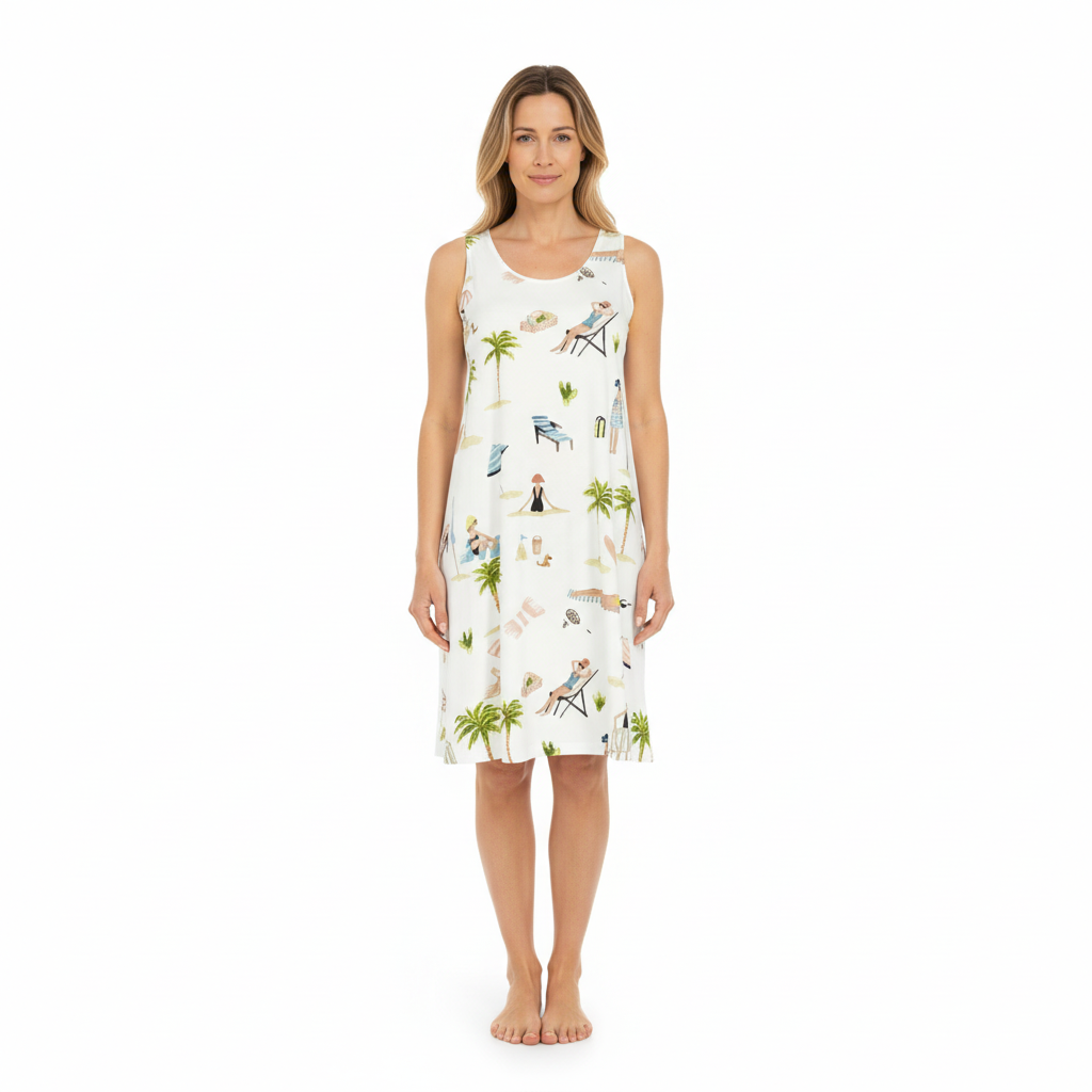 Dieses stilvolle Nachthemd überzeugt durch seinen bequemen Schnitt und das attraktive Design. Der Rundhalsausschnitt sorgt für einen klassischen Look, während das ärmellose, A-linienförmige Design viel Bewegungsfreiheit und Komfort bietet. Das bezaubernde Beach-Dessin verleiht dem Nachthemd ein sommerliches Flair und Urlaubsgefühle. Gefertigt aus hochwertigem Baumwoll-Modal in Single Jersey-Qualität, fühlt sich das Nachthemd besonders angenehm auf der Haut an und ist ideal für einen erholsamen Schlaf bei sommerlichen Temperaturen.