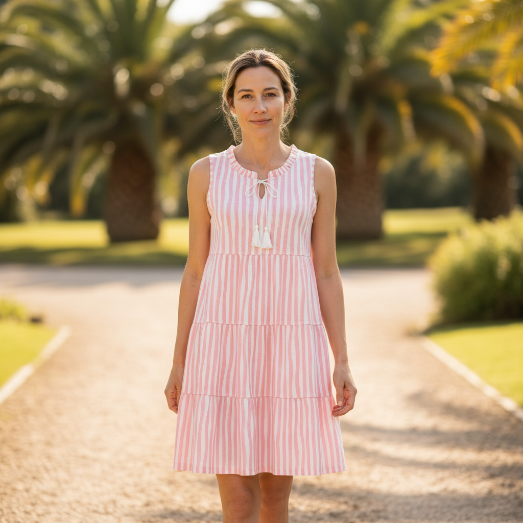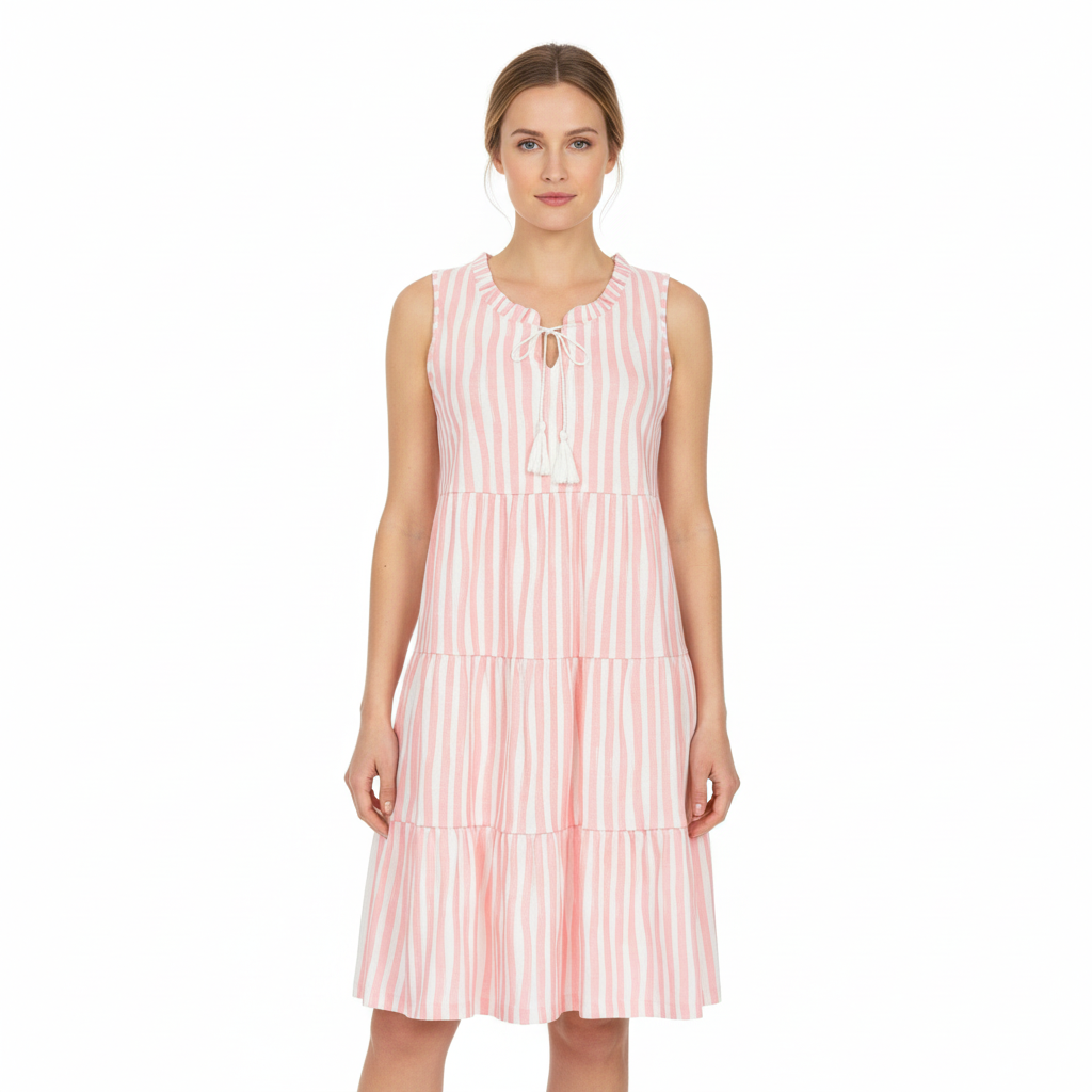 Einfach zauberhaft ist dieses Sleepshirt. Das Dessin im Streifenlook ist ein absolut topmodischer Style. Mit Rüschchen und einer Kordel mit Quasten am Ausschnitt gefertigt. Ohne Arm schön luftig für die warme Sommerzeit. Stufenvolants machen den Look komplett. Die weiche Baumwolle in bewährter Single Jersey-Qualität garantiert jederzeit ein gutes Tragegefühl. Der Stoff zeichnet sich weiterhin durch Atmungsaktivität und Pflegeleichtigkeit aus.