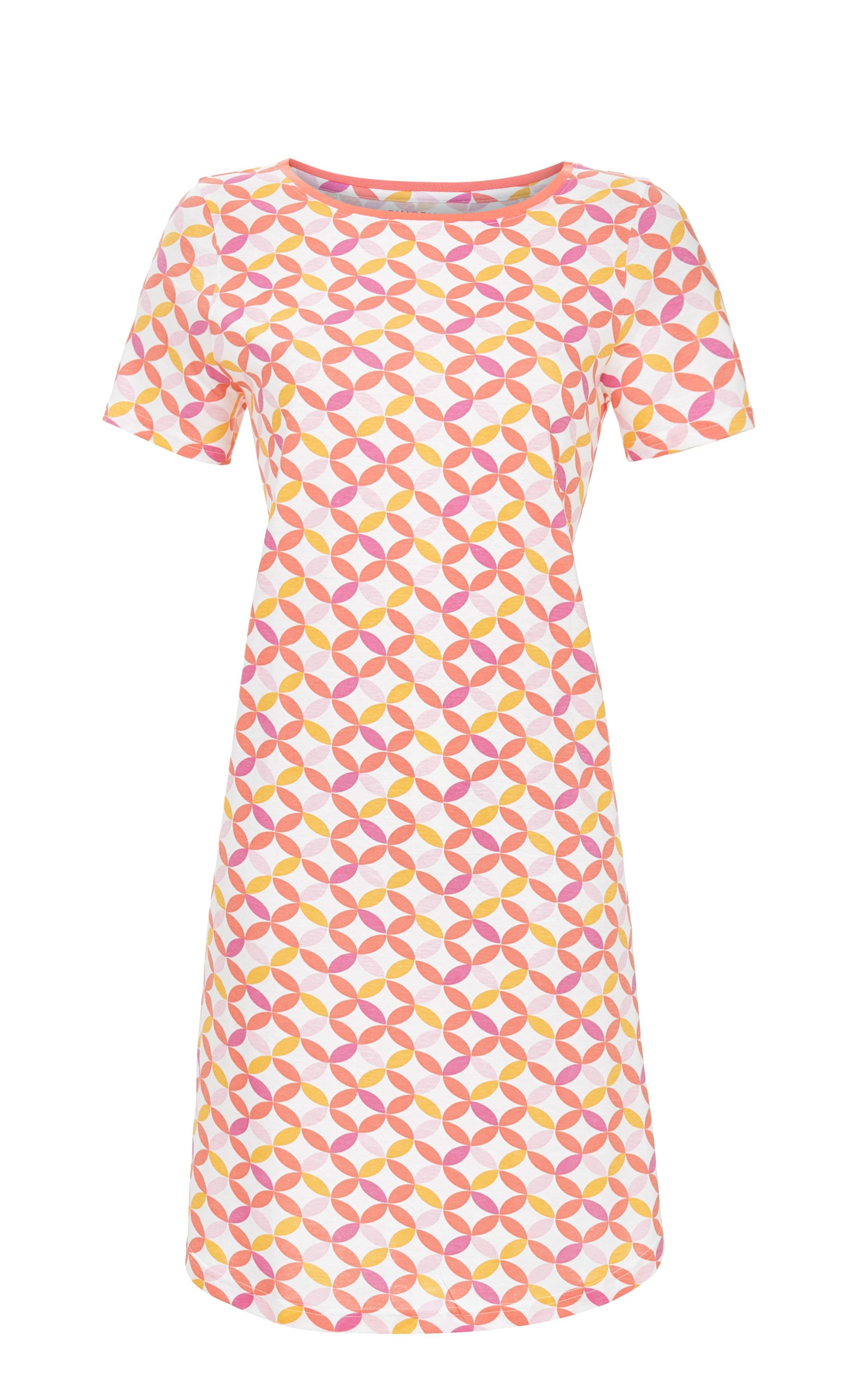 Dieses stilvolle Nachthemd überzeugt durch sein modernes, abstraktes Dessin und den eleganten Rundhalsausschnitt mit Kontrastpaspel. Die kurzen Ärmel sorgen für angenehme Bewegungsfreiheit, während der leicht gerundete Saum für einen femininen, lässigen Look steht. Hergestellt aus hochwertigem Baumwoll-Modal-Mix in Single Jersey-Qualität, bietet das Nachthemd ein äußerst weiches, angenehmes Tragegefühl und eine perfekte Passform. Ein schönes Modell für die Sommerzeit.