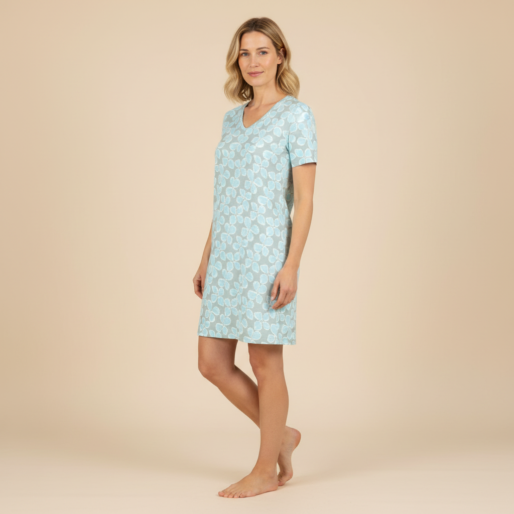Dieses elegante Sleepshirt besticht durch seinen femininen V-Ausschnitt und den schönen Flowerprint, der für einen frischen, lebendigen Look sorgt. Der A-Linien-Schnitt verleiht dem Sleepshirt eine angenehme Weite und steht für eine gute Passform sowie Bewegungsfreiheit. Die kurzen Ärmel machen es perfekt für den Sommer. Hergestellt aus einem hochwertigen Baumwoll-Modal-Mix, bietet das Sleepshirt ein besonders softes und angenehmes Tragegefühl auf der Haut. Ideal für erholsamen Schlaf.