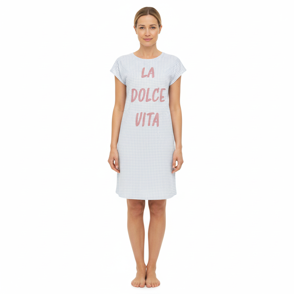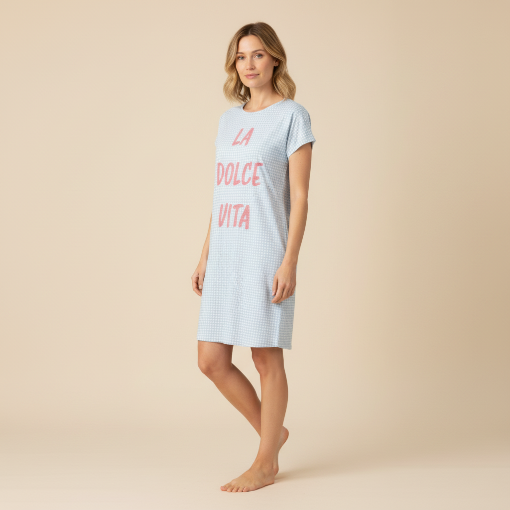 Dieses bezaubernde Sleepshirt besticht durch sein verspieltes Pünktchen-Allover-Design und dem bequemen Rundhalsausschnitt. Mit überschnittener Schulter ist es besonders ideal für warme Nächte und bietet angenehme Bewegungsfreiheit. Der Letterprint LA DOLCE VITA verleiht dem Modell einen frischen und fröhlichen Look. Hergestellt aus einer hochwertigen Baumwoll-Modal-Mischung, sorgt das Sleepshirt für ein äußerst weiches und angenehmes Tragegefühl auf der Haut. Perfekt für entspannte Nächte oder gemütliche Stunden zu Hause.