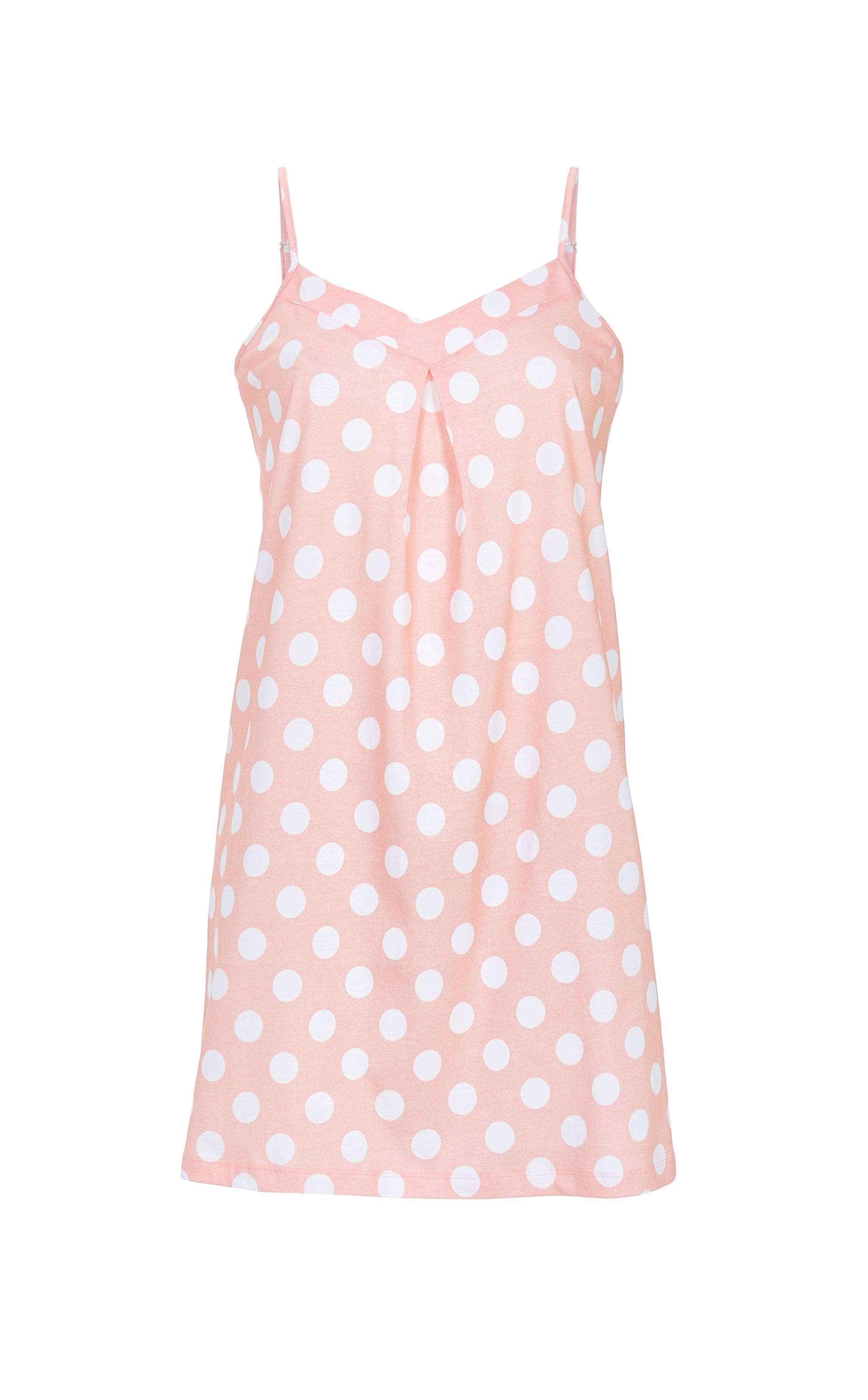 Topmodisch präsentiert sich dieses Sleepshirt in pastelliger Farbstellung. Das Dessin mit Punkten ist ein gelungener Hingucker. Verstellbare Spaghettiträger sorgen für optimale Passform. Eine Kellerfalte am Ausschnitt gibt dem Modell eine besondere Note. Dieser schicke Style macht einfach Lust auf Sommer. Komfort und ein angenehmes Tragegefühl garantiert die reine Baumwolle in Single Jersey-Qualität.
