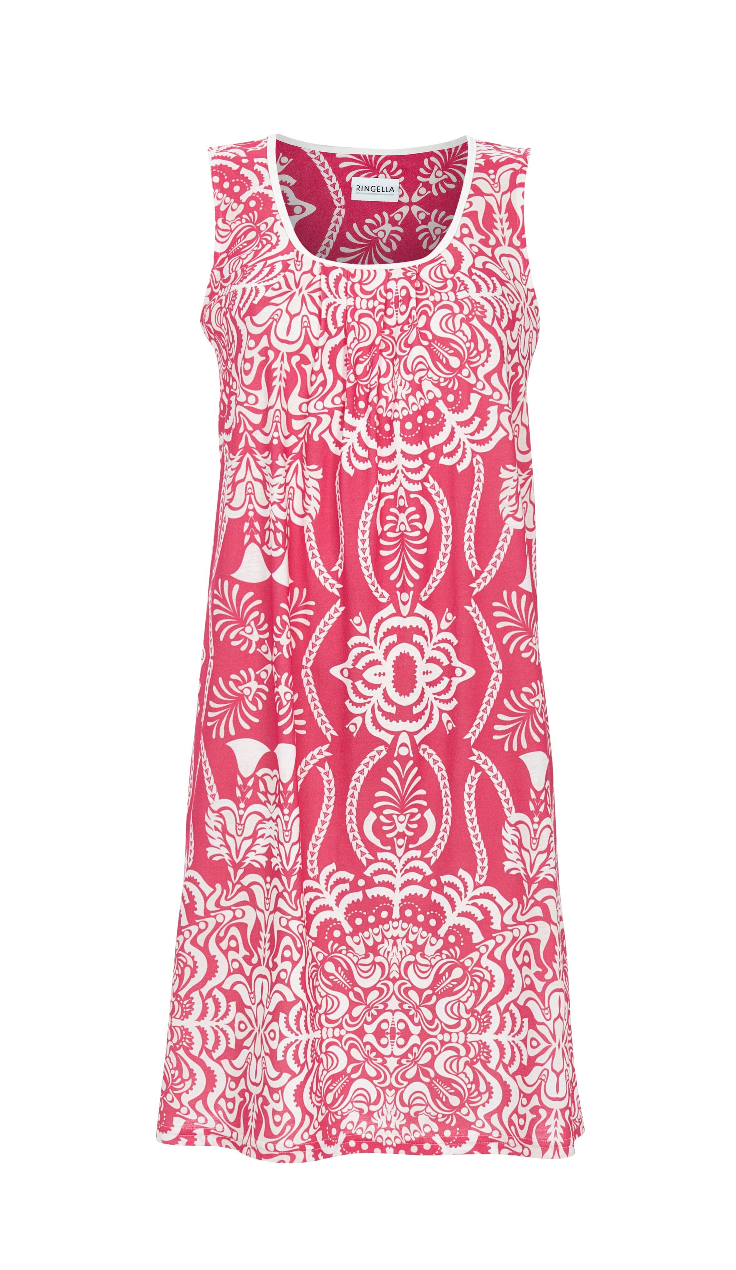 Elegantes Damenkleid mit Rundhalsausschnitt und edler Biesenverarbeitung am Ausschnitt, die für eine feminine Silhouette sorgt. Das ärmellose Design macht das Kleid ideal für warme Tage. Das ornamentale Dessin verleiht dem Kleid einen stilvollen und modernen Look. Gefertigt aus hochwertiger Baumwoll-Modal-Mischung in Single Jersey-Qualität, bietet es ein angenehmes Tragegefühl und einen bequemen Sitz. Ein perfektes Kleid für schöne und entspannte Anlässe.