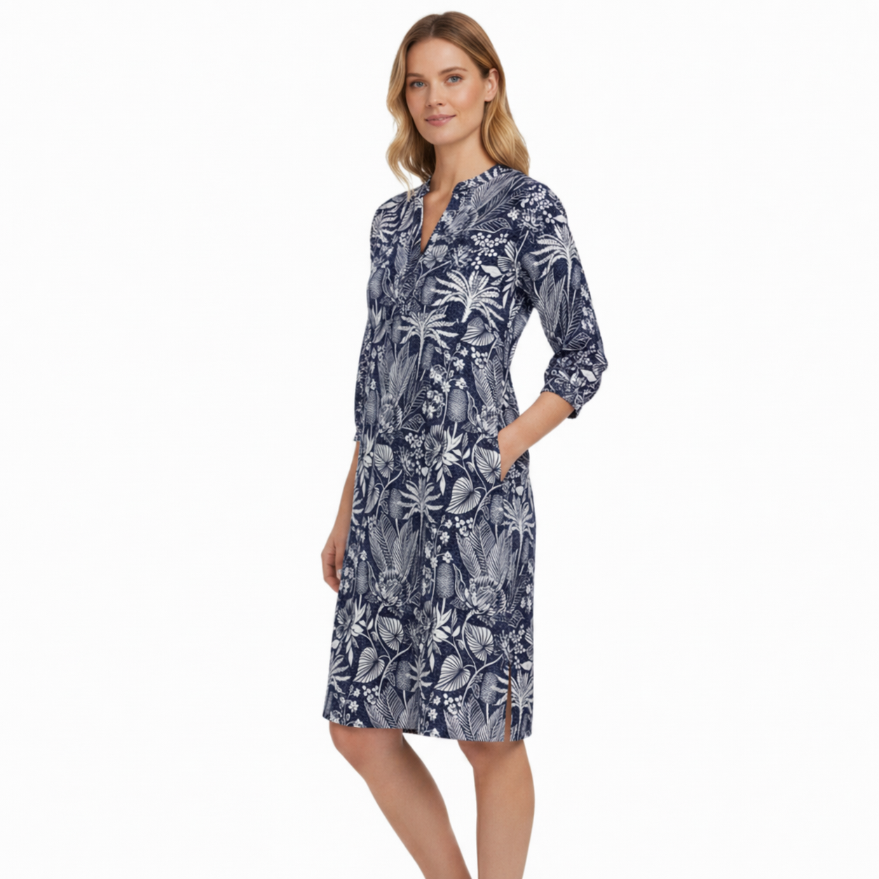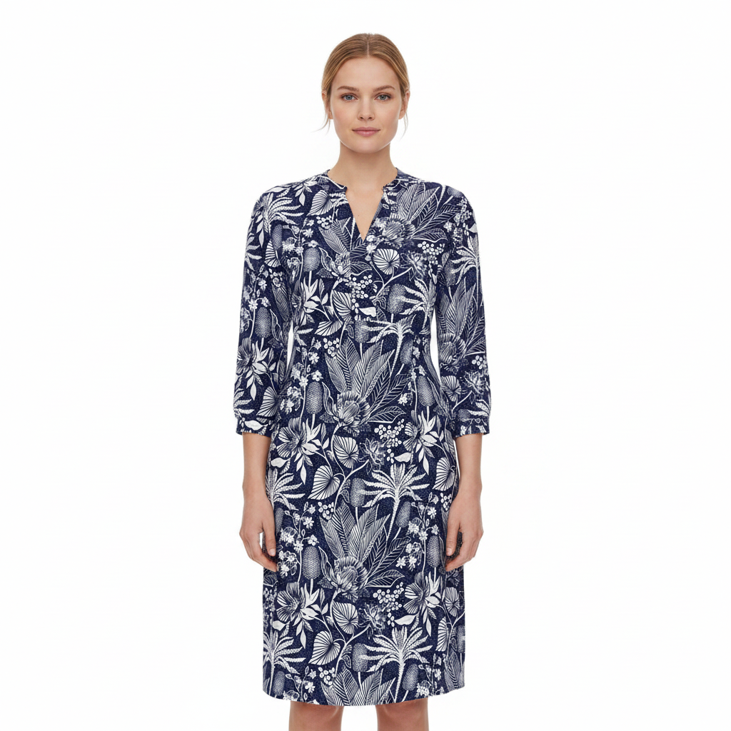 Dieses wunderschöne Tunikakleid im Blumendessin ist ein absolutes Must-Have für Ihre Garderobe. Der V-Ausschnitt sorgt für eine schmeichelhafte Silhouette, während die 3/4-Ärmel ideal für Übergangszeiten sind. Praktische seitliche Eingrifftaschen bieten nicht nur Funktionalität, sondern auch einen lässigen Touch. Der Saum mit Seitenschlitzen verleiht dem Tunikakleid eine moderne Note und steht für Bewegungsfreiheit. Hergestellt aus hochwertiger Viskose in Voile-Qualität, garantiert das Tunikakleid ein angenehmes Tragegefühl und eine luftige Leichtigkeit, die perfekt für warme Tage ist.