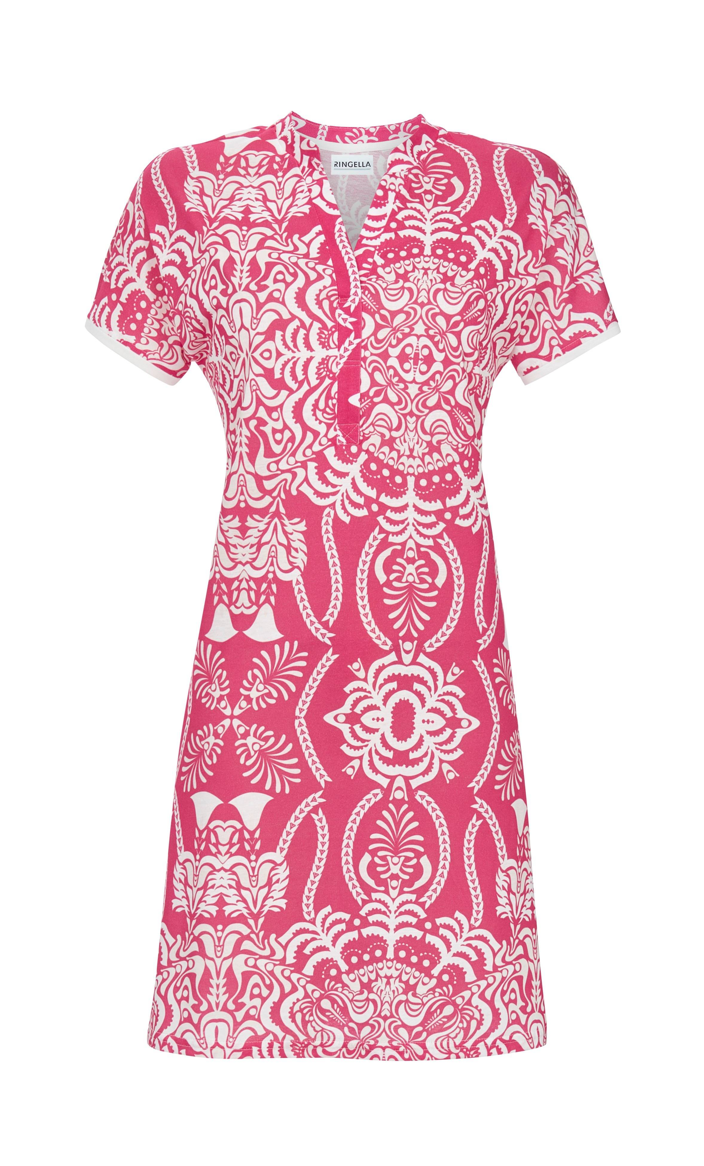 Stylisches Tunikakleid mit ornamentalem Dessin, das elegante und verspielte Akzente setzt. Die überschnittenen Schultern sorgen für einen lässigen und femininen Look. Der dekorative Splitneck ergänzt das Design perfekt. Gefertigt aus hochwertiger Baumwoll-Modal-Mischung in Single Jersey-Qualität bietet es ein angenehmes Tragegefühl und eine schöne, lockere Passform. Einfach ideal für entspannte und stilvolle Tage.