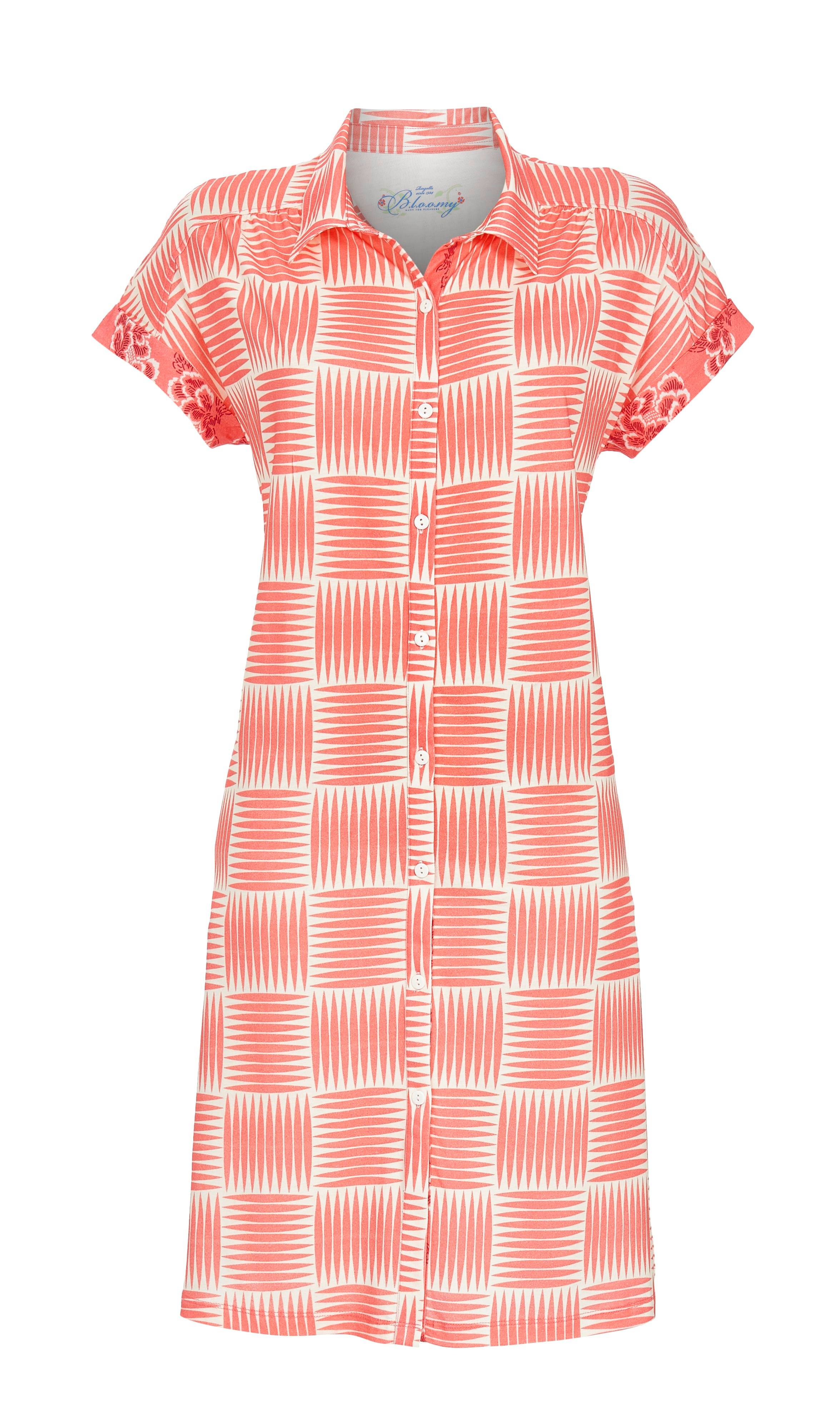 Trendiges Hemdblusenkleid mit durchgehender Knopfleiste und kleinem Kragen. Das Design punktet mit überschnittenen Schultern und seitlichen Schlitzen am Saum, die für eine bequeme Passform sorgen. Das abstrakte Dessin verleiht dem Kleid eine moderne und stilvolle Ausstrahlung. Hergestellt aus hochwertiger Baumwoll-Modal-Ware in Single Jersey-Qualität ist ein angenehmer Tragekomfort garantiert. Ein ideales Teil für warme Sommertage.