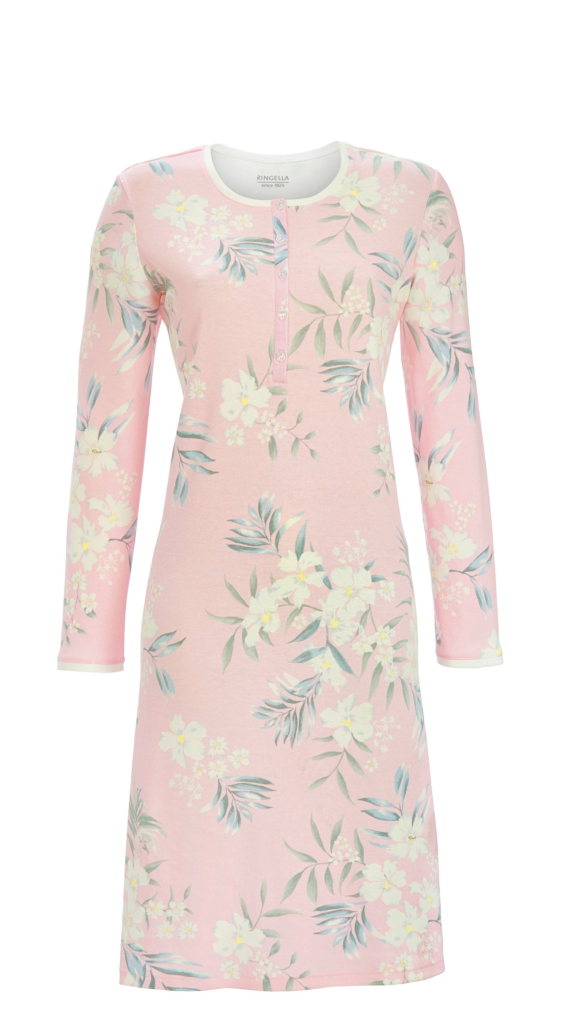 Genießen Sie stilvollen Komfort mit unserem charmanten Sleepshirt, das sowohl Eleganz als auch Gemütlichkeit vereint. Dieses bezaubernde Sleepshirt mit Langarm ist ideal für kühlere Nächte und spendet Wärme. Mit einem klassischen Halsausschnitt, der durch den Kontrastpaspel einen modischen Akzent erhält. Die Knopfleiste ist praktisch und ermöglicht ein einfaches An- und Ausziehen. Ein fröhliches und sanftes Blumendessin in pastelligen Farben verleiht dem Sleepshirt eine frische und feminine Note. Hergestellt aus einem hochwertigen Baumwolle-Polyester-Mix in Interlock-Qualität, bietet es ein weiches Tragegefühl und eine angenehme Passform. Dieses Sleepshirt ist die perfekte Wahl für Frauen, die Wert auf Stil und Komfort legen. Gönnen Sie sich dieses hübsche Sleepshirt und genießen Sie entspannte Nächte in einem modischen Look.
