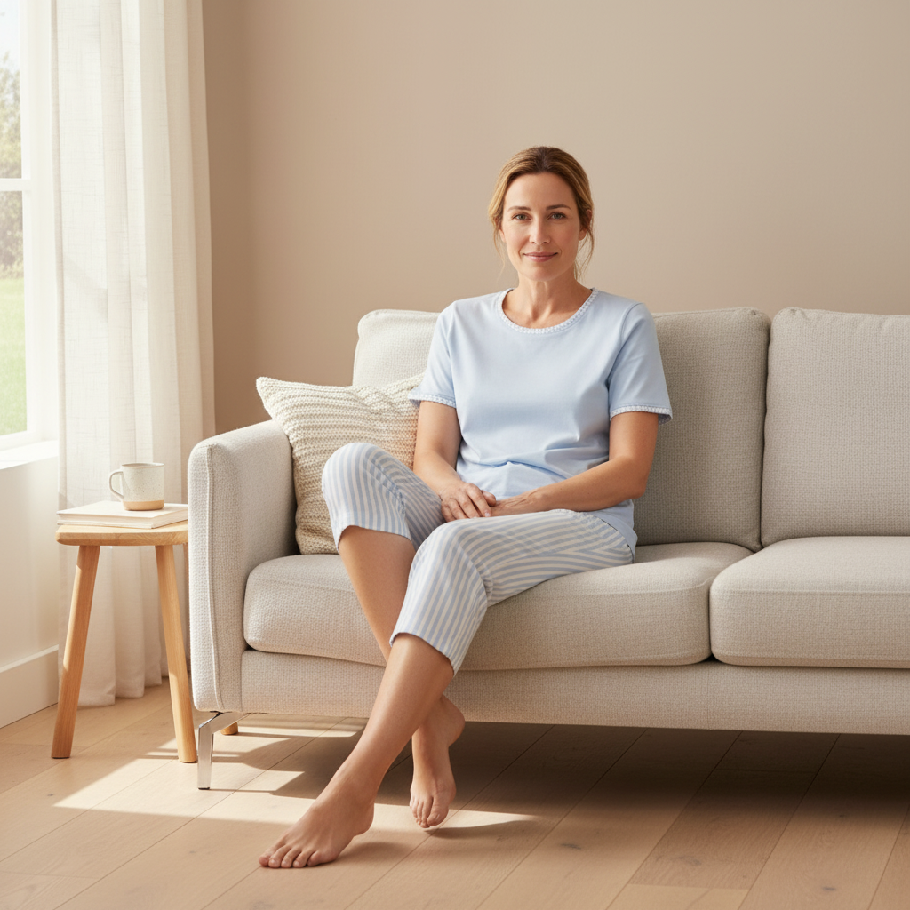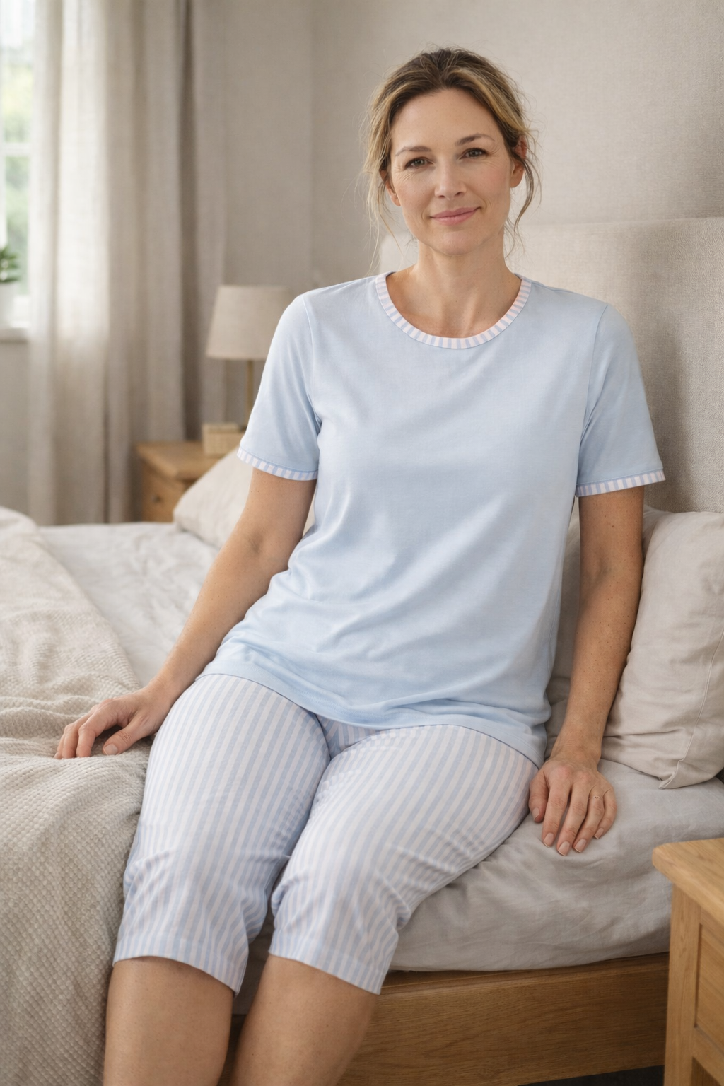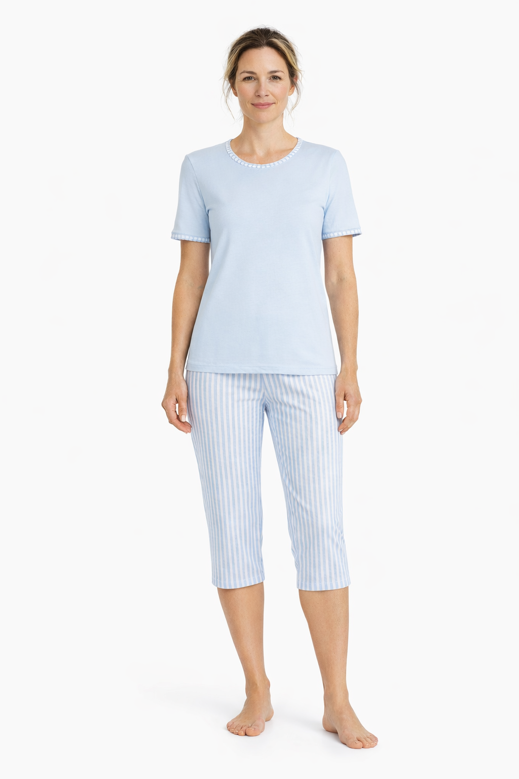 Dieser gemütliche Schlafanzug vereint Komfort und Stil. Das unifarbene Oberteil mit Rundhalsausschnitt, Kurzarm und Kontrastpaspel steht für angenehme Luftigkeit und einen klassischen Look. Die gestreifte Caprihose ist mit einem elastischen Gummizugbund versehen, der perfekt sitzt. Die Hosenbeine sind mit einem seitlichen Schlitz gestaltet, was für eine moderne und bequeme Passform sorgt. Gefertigt aus einem hochwertigen Baumwoll-Modal-Mix in Single Jersey-Qualität, bietet das Set ein besonders weiches und angenehmes Tragegefühl auf der Haut. Ideal für entspannte Nächte oder ruhige Stunden zu Hause.