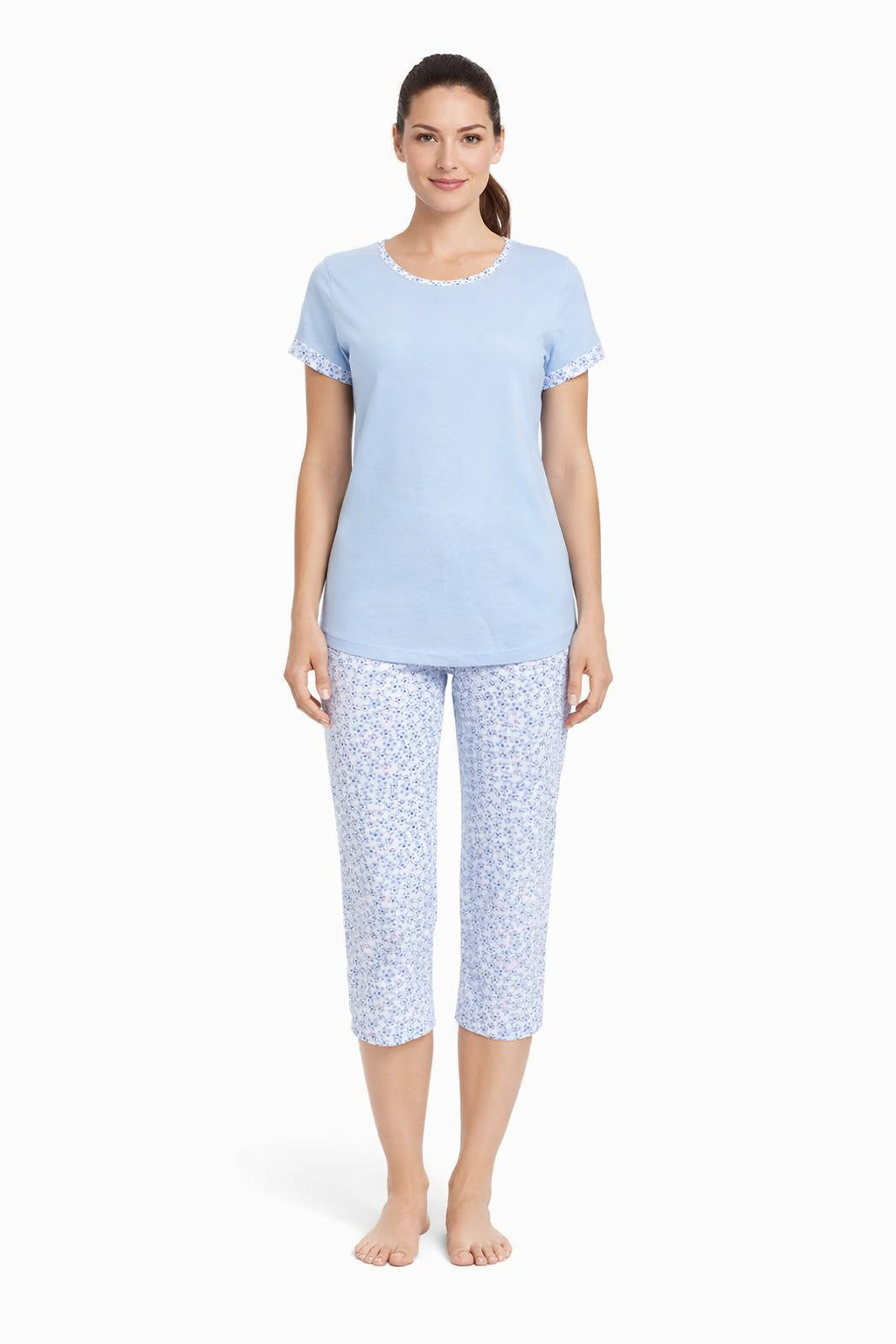 Im abstrakten Blümchen-Allover wird dieser Schlafanzug verzaubert. Die modische Caprihose hat am Hosenbein einen Seitenschlitz. Das Oberteil wird in Uni kombiniert und mit Kontrastpaspel am Halsausschnitt, sowie Kontrastblenden am Ärmelsaum verziert. Der Schlafanzug überzeugt mit natürlichem Material reiner Baumwolle, die sich wunderbar weich auf der Haut anfühlt und für angenehmen Schlafkomfort sorgt.