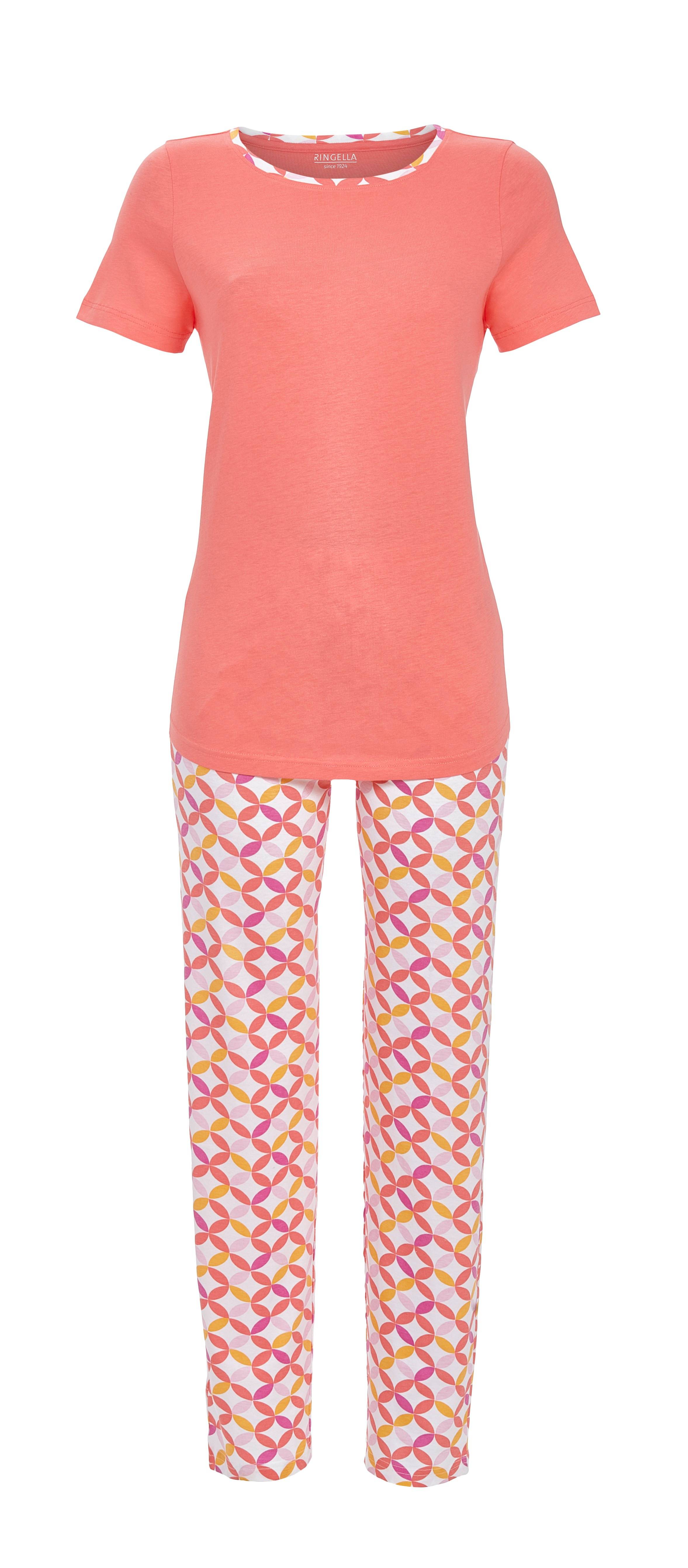 Dieser stilvolle Schlafanzug überzeugt durch sein modernes, abstraktes Dessin der Hose und den eleganten Rundhalsausschnitt mit Kontrastpaspel des unifarbigen Shirts. Die kurzen Ärmel sorgen für angenehme Bewegungsfreiheit. Hergestellt aus hochwertigem Baumwoll-Modal-Mix in Single Jersey-Qualität, bietet der Schlafanzug ein äußerst weiches, angenehmes Tragegefühl und eine perfekte Passform. Ein schönes Modell für die Sommerzeit.