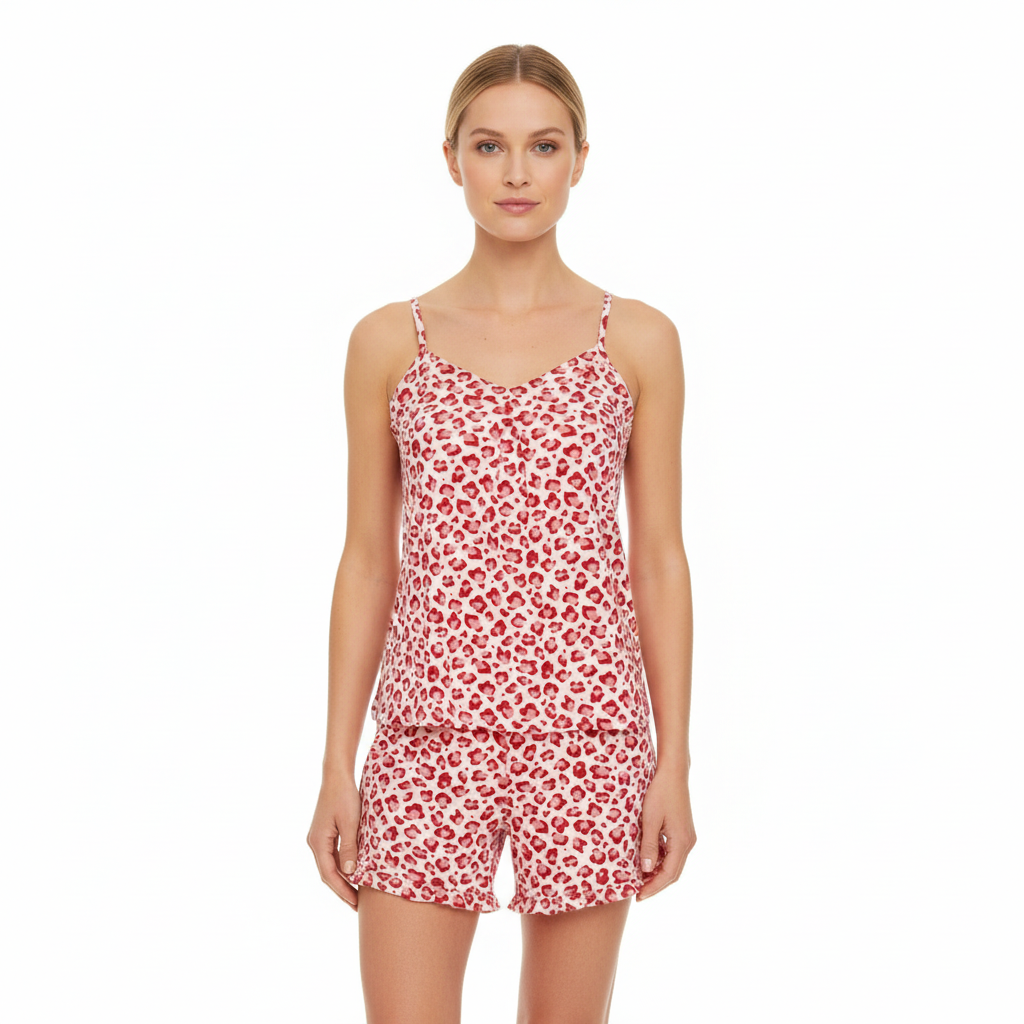 Topmodisch präsentiert sich dieser Shorty im Animalprint. In rötlicher Farbstellung auf pastelligem Fond ist er ein gelungener Hingucker. Verstellbare Spaghettiträger sorgen für optimale Passform. Die Rüschchenabschlüsse am Hosenbein untertreichen den romantischen Look. Dieser schicke Style macht einfach Lust auf Sommer. Für Komfort und ein angenehmes Tragegefühl sorgt der Viskose-Elasthan-Mix in Single Jersey-Qualität.