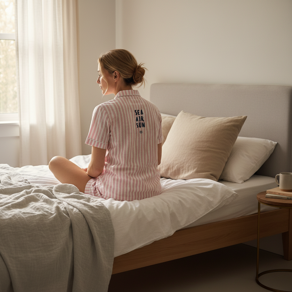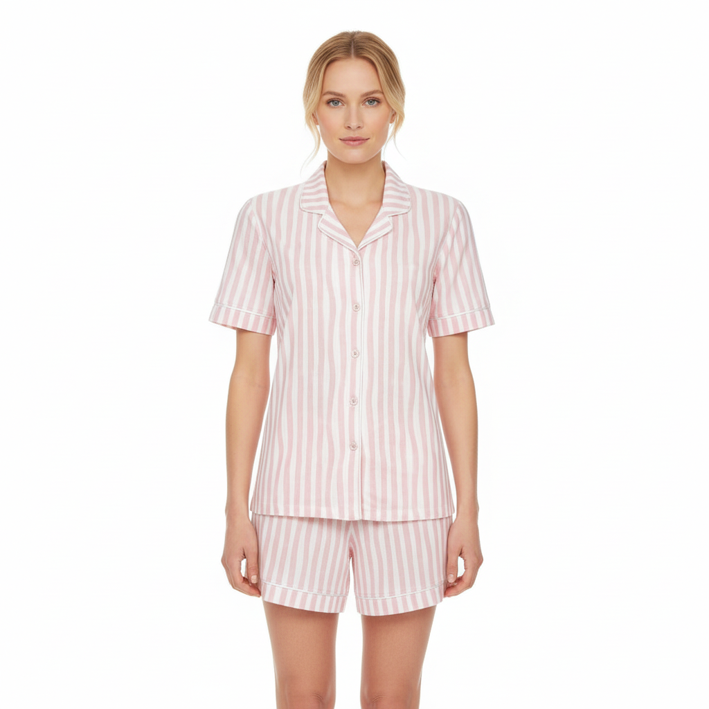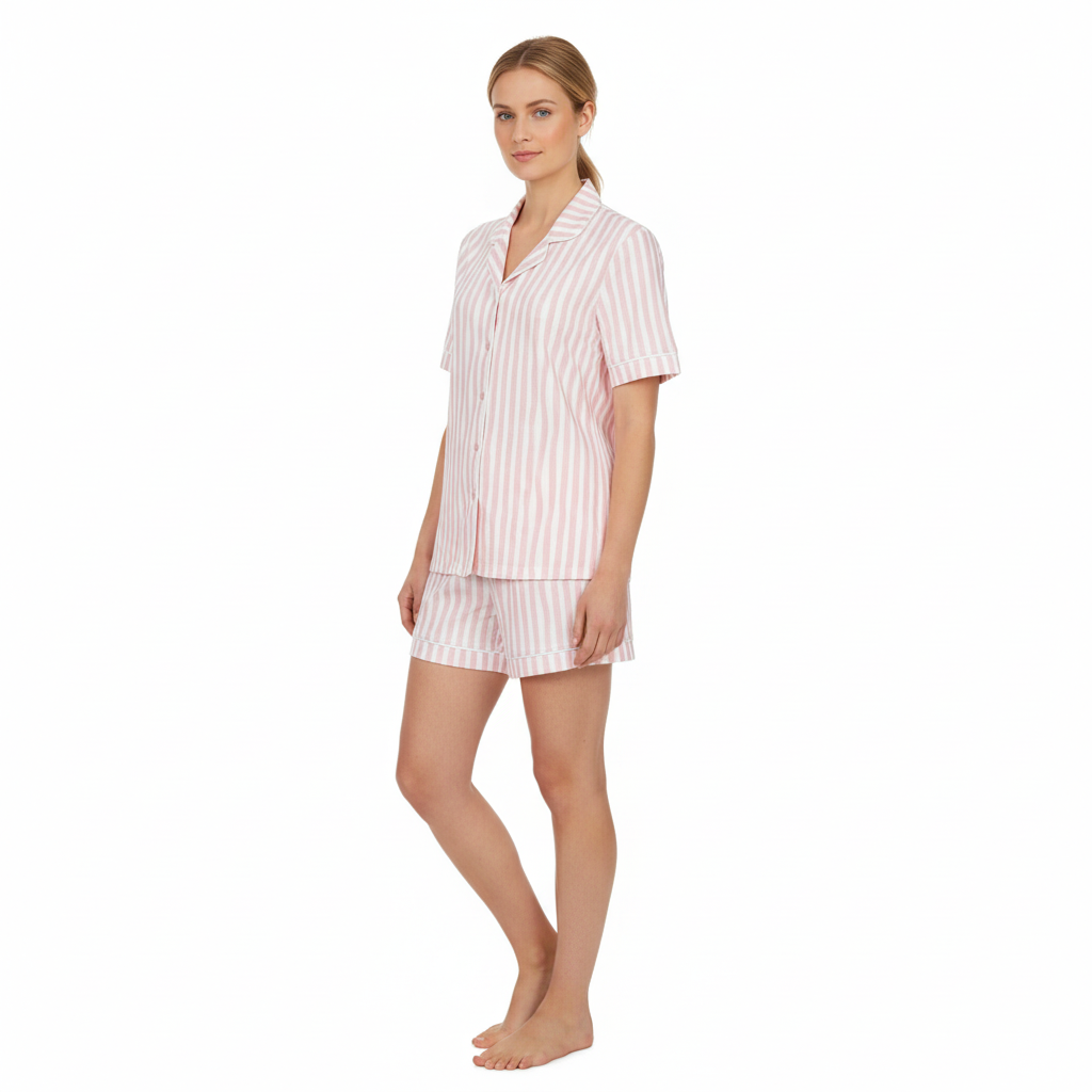 Dieser bezaubernde Shorty überzeugt durch sein modernes Streifendessin. In klassisch durchgeknöpfter Reversform aufgemacht und mit Paspel verziert. Die Shorts mit praktischem Gummizugbund, Bindeband und seitlichen Eingrifftaschen für vollsten Komfort. Zum Hingucker wird das Rückenteil mit Motivdruck. Gönnen Sie sich dieses stylische Teil und genießen Sie die Sommerzeit.