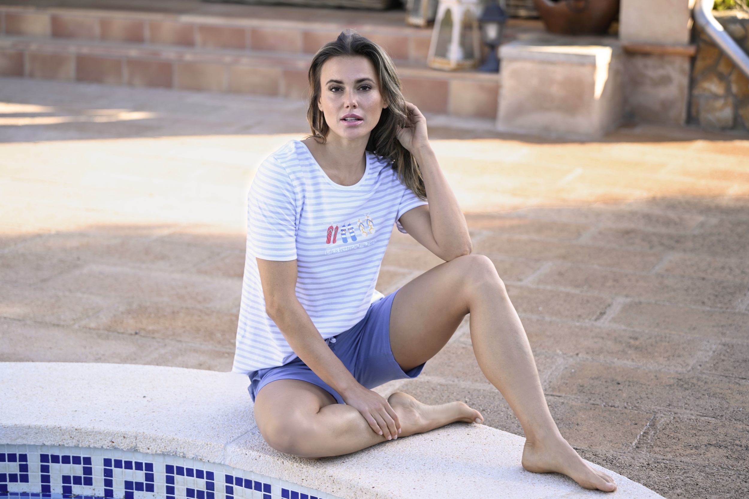 Dieser Kurzpyjama macht einfach Lust auf Sommer. Mit einem hübschen Motivdruck mit Flip Flops auf dem Vorderteil wird er schnell zum Hingucker. Das Oberteil im trendigen Ringeldessin und die unifarbige Shorts mit praktischen Eingrifftaschen garantiert Ihnen bequeme Stunden und läßt die modische Komponente nicht zu kurz kommen. Zugleich bietet das Material reiner Baumwolle in Single Jersey-Qualität vollsten Tragekomfort.