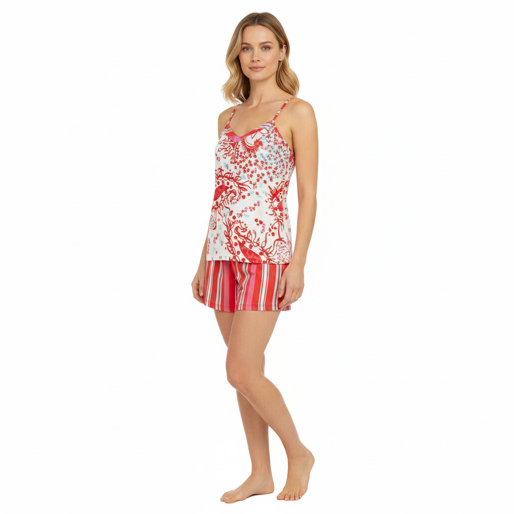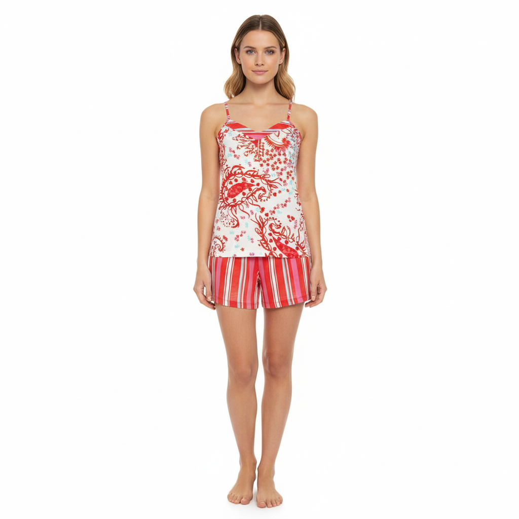 Dieser Shorty ist das ideale Sommermodell an heißen Tagen. Das Shirt im trendigen Paisley-Dessin wird in Kombination mit gestreifter Shorts zu einem stylischen Modell. Für Komfort sorgen die verstellbaren Spaghettiträger, der Gummizugbund der Hose mit Bindeband und seitliche Eingrifftaschen. So können Sie sich rundum wohlfühlen. Die weiche Baumwoll-Modalware in Single Jersey-Qualität schmiegt sich an Ihren Körper an und garantiert vollsten Tragekomfort.
