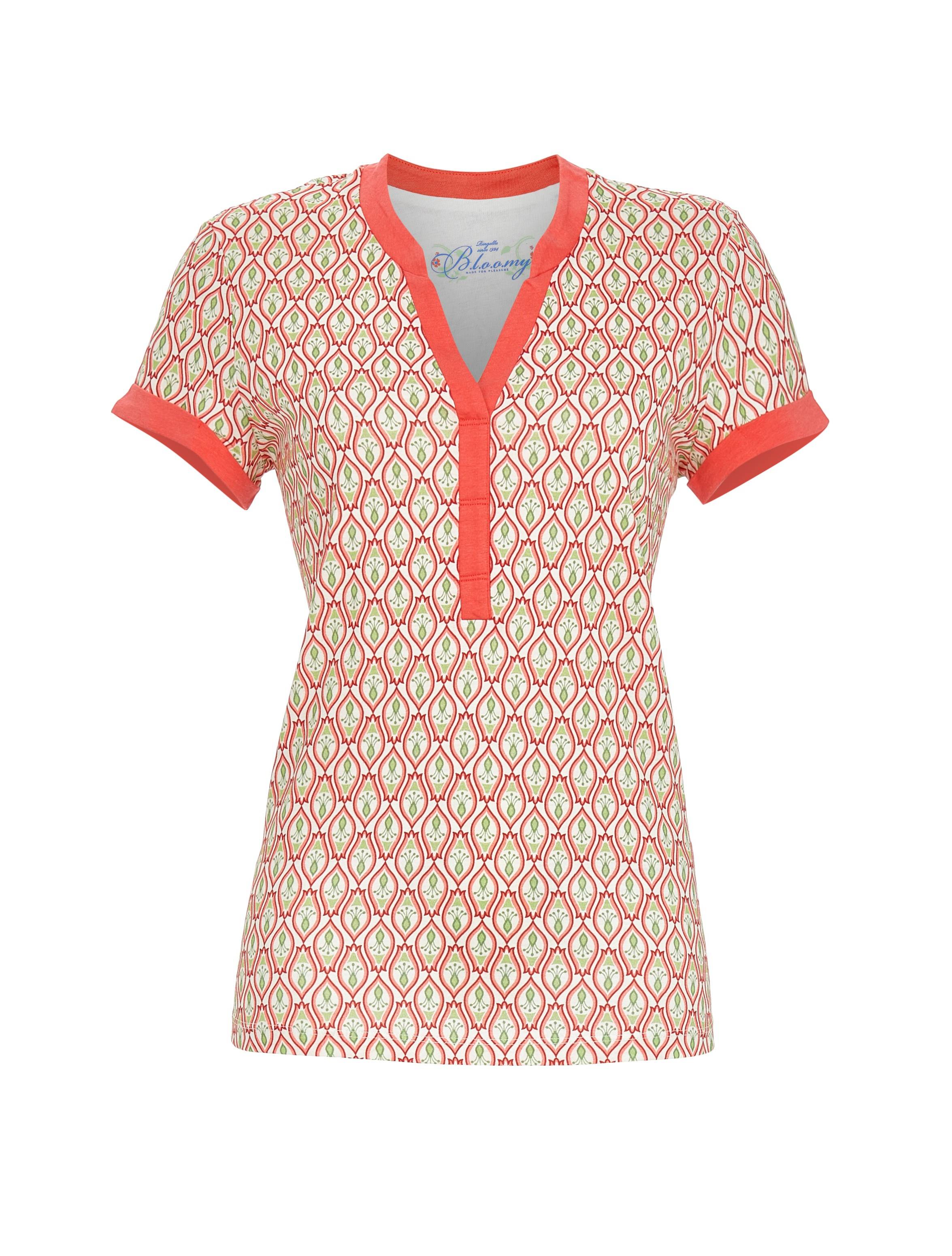 Elegantes T-Shirt mit V-Ausschnitt und kurzen Ärmeln, verziert mit einem ornamentalen Dessin. Hergestellt aus hochwertiger Baumwoll-Modal-Ware in Single Jersey-Qualität, sorgt es für ein angenehmes Tragegefühl, weiche Haptik und eine lockere Passform. Perfekt für einen stilvollen, lässigen Look an warmen Tagen. Mit einer Hose aus der aktuellen Kollektion ist das Outfit komplett.