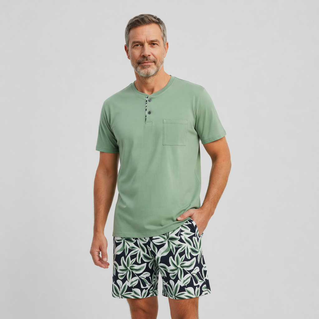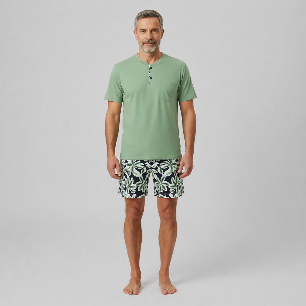 Jung und modern stellt sich dieser Kurzpyjama vor. Im trendigen, abstrakten Dessin ist die Bermudahose ein richtiger Blickfang. Praktisch ist der dehnbare Hosenbund mit Gummizug und seitliche Eingrifftaschen. Das Oberteil in Uni ist perfekt abgestimmt und eine schöne Ergänzung. Mit Strickbündchen am Ausschnitt und kurzer Knopfleiste für mehr Komfort. Hergestellt aus hochwertiger Baumwolle in Single Jersey-Qualität liegt der Stoff weich auf der Haut und sorgt für vollsten Tragekomfort. Ideal für eine erholsame Nacht und entspannte Stunden zu Hause.