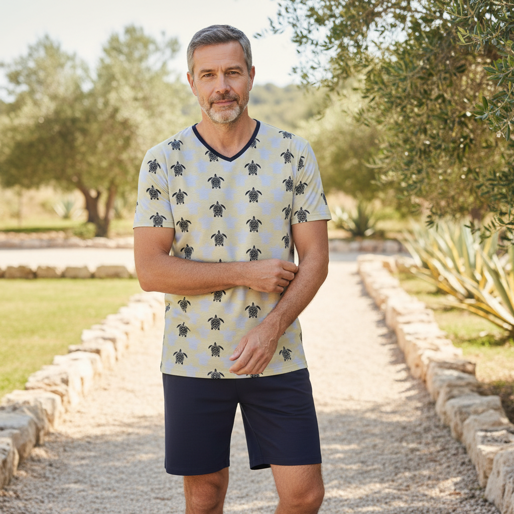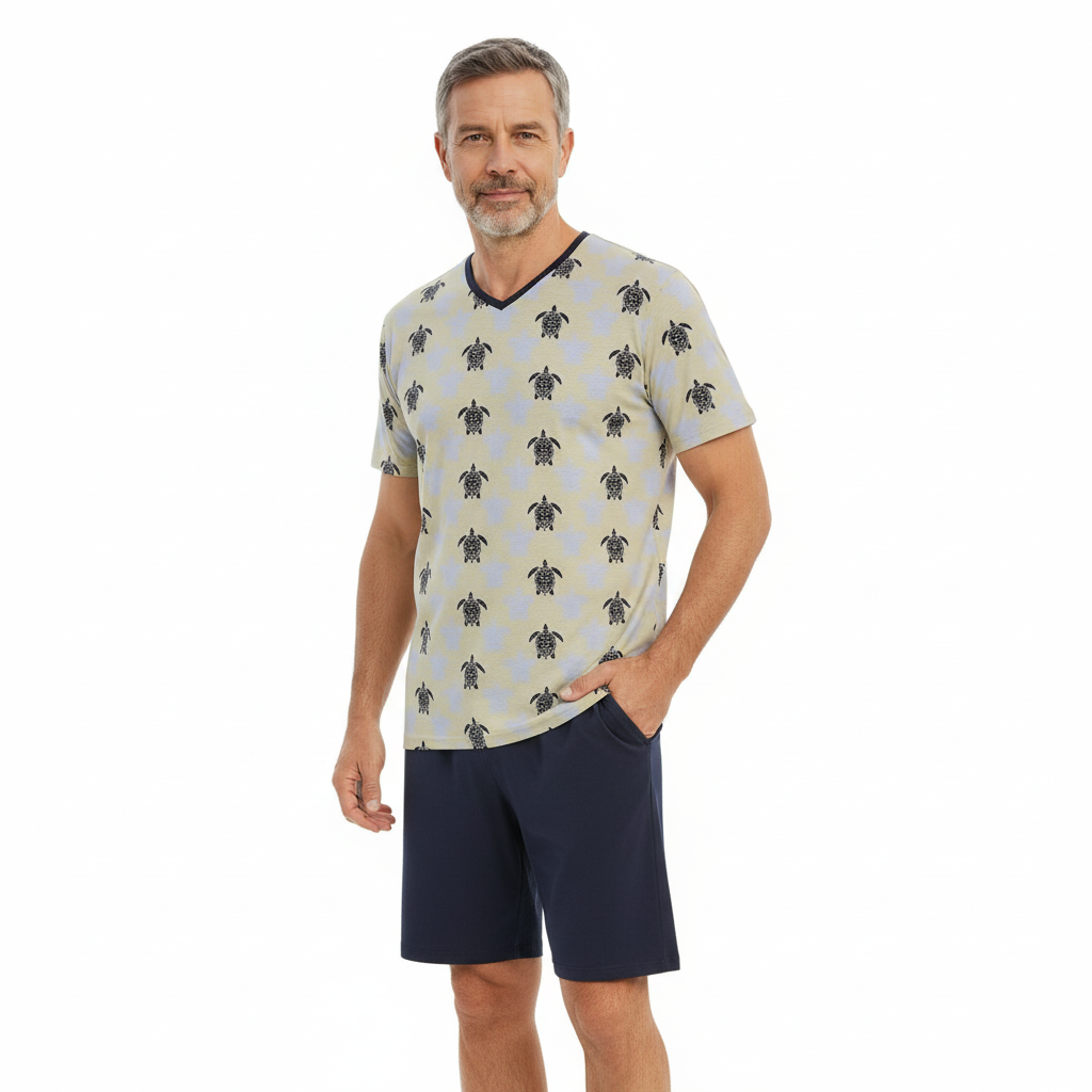 Modischer Herren-Kurzpyjama mit V-Ausschnitt und kurzen Ärmeln, kombiniert mit einer unifarbigen Bermuda-Hose mit Gummizugbund und seitlichen Eingrifftaschen. Das charmante Dessin mit Schildkröten des Oberteils verleiht dem Shorty einen verspielten Look. Gefertigt aus reiner Baumwolle in hochwertiger Single-Jersey-Qualität sorgt er für angenehmen Tragekomfort und eine lockere Passform. Perfekt für entspannte Nächte und gemütliche Stunden zu Hause.