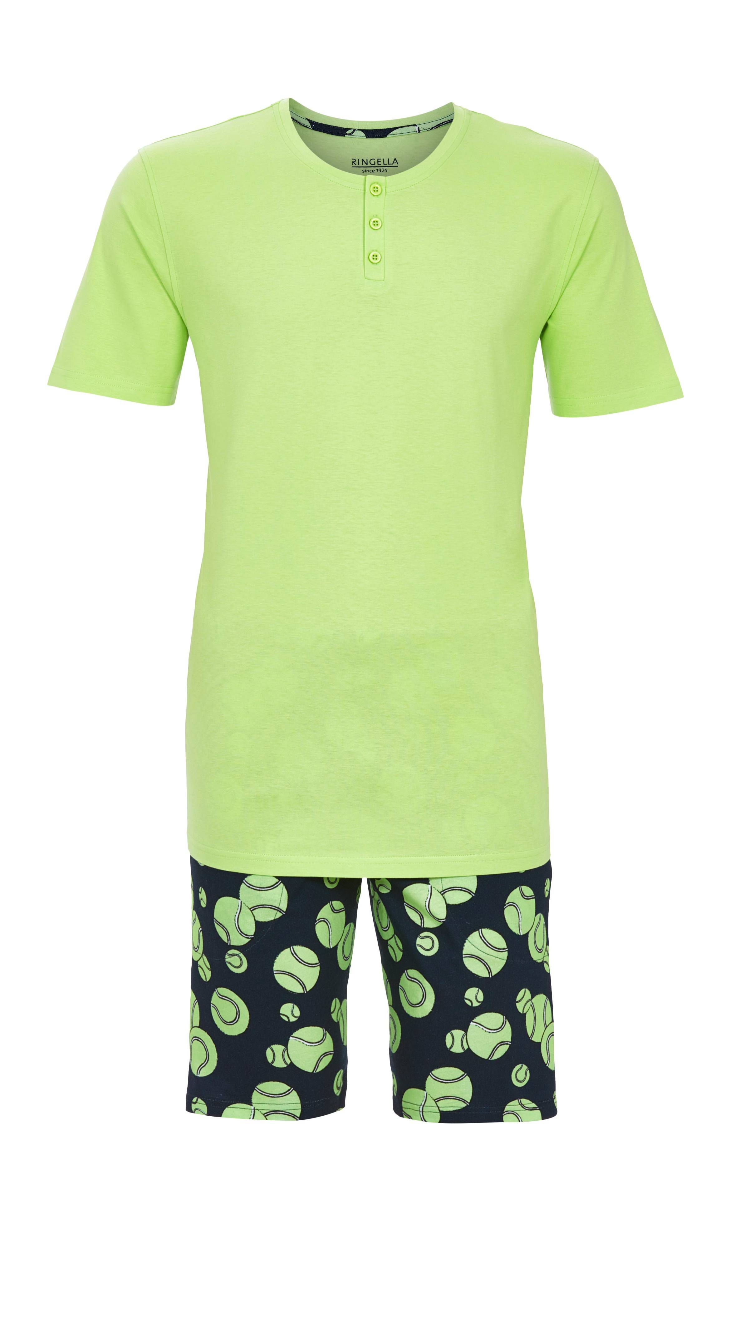 Mit diesem Kurz-Pyjama liegen Sie ganz im Trend. Das Dessin mit Tennisbällen für die Bermuda-Hose ist ein schöner Blickfang und wird Sie begeistern. Die Bermuda hat einen weichen Gummizugbund und seitliche Engrifftaschen. Das unifarbige Oberteil ist farblich abgestimmt und mit Rundhals-Ausschnitt und Knopfleiste eine gelungene Ergänzung. Das Material des Shortys ist hautfreundlich und pflegeleicht. So kommen Sie gut gekleidet durch die warme Jahreszeit.